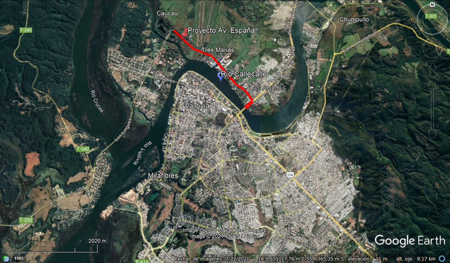 El trabajo corresponde a la elaboración de la memoria de cálculo del diseño estructural de pavimentos del proyecto «Mejoramiento Av. España, Valdivia”, eje que se encuentra al norte del río Calle-Calle en la ciudad de Valdivia. La Figura presenta la ubicación referencial del proyecto el cual tiene una longitud aproximada de 3 km.