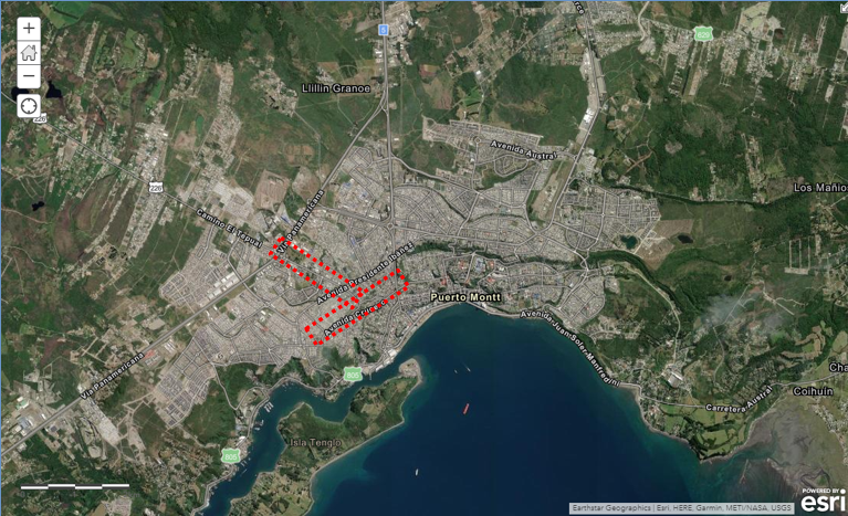 El trabajo corresponde a la elaboración de la memoria de cálculo del diseño estructural de pavimentos del proyecto «Mejoramiento Interconexión Vial Centro Poniente”, Puerto Montt. La siguiente Figura presenta la ubicación referencial del proyecto.